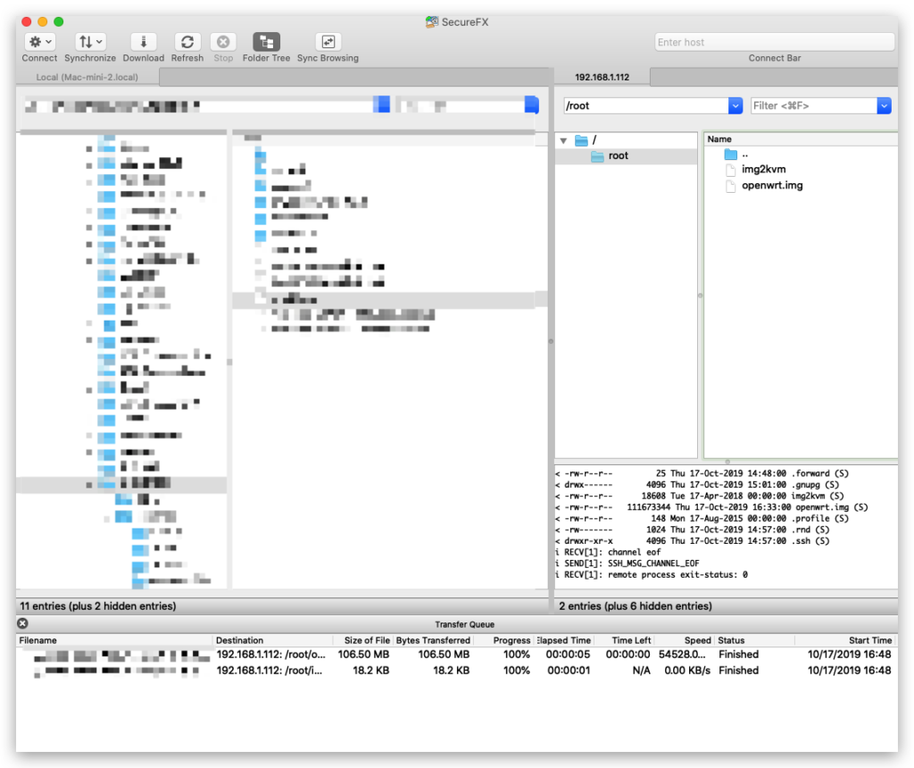 我是苹果Mac 使用SecureFX登陆pve,上传已经下载的OpenWrt X86固件img文件和转换工具img2kvm到pve root目录。windows可用putty上传。