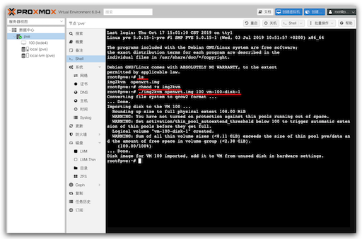 **镜像转换 ** chmod +x img2kvm ./img2kvm openwr.img 104 vm-104-disk-1 openwrt.img是你上传的openwrt x86固件img文件,104是VM ID,disk-1是不重复的硬盘位置码。