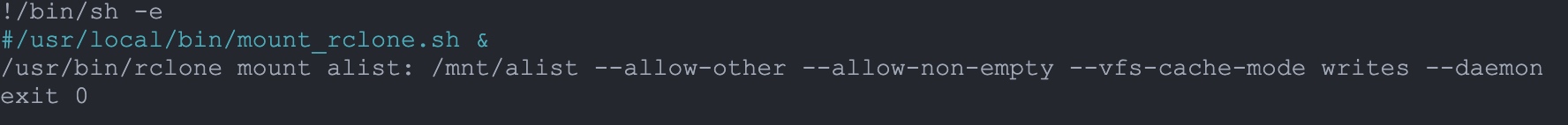 /usr/bin/rclone mount alist: /mnt/alist --allow-other --allow-non-empty --vfs-cache-mode writes --daemon