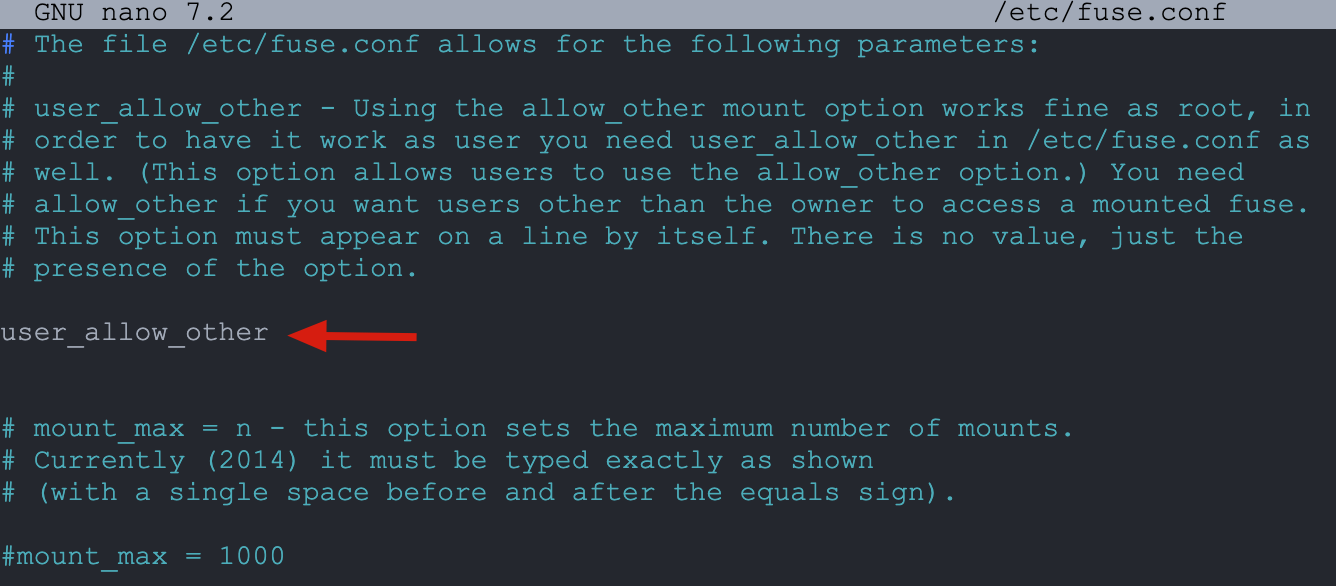 sudo nano /etc/fuse.conf