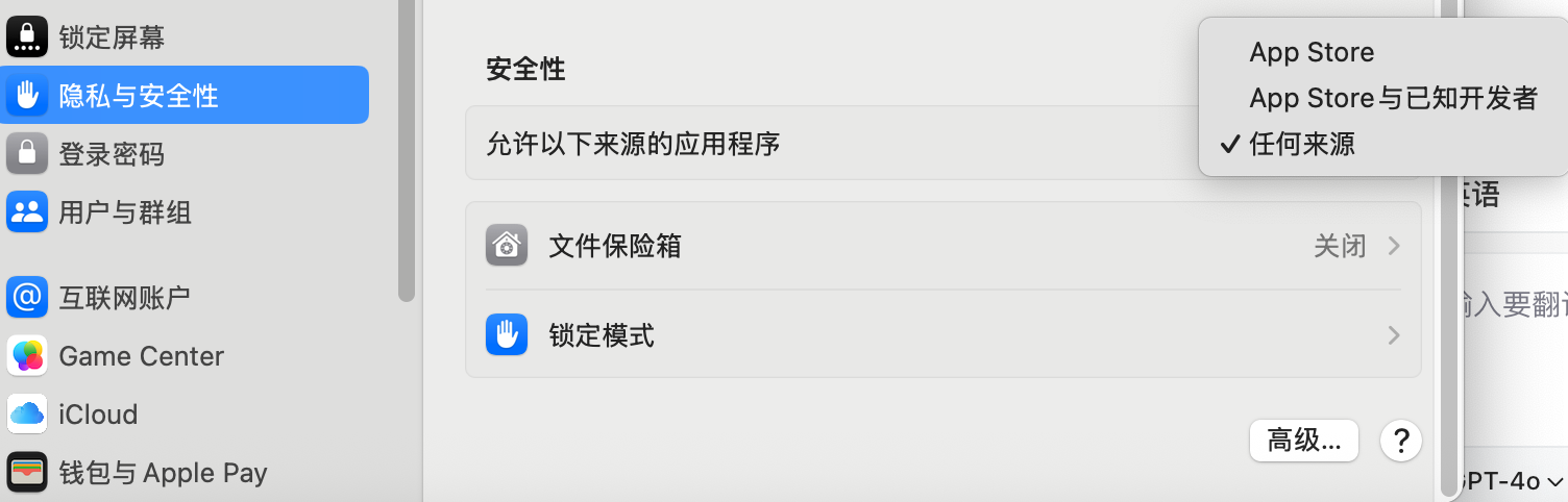 macOS Ventura 略有变化,位于:系统设置 – 隐私和安全性,“安全性”(参看下述第 3 点截图)。